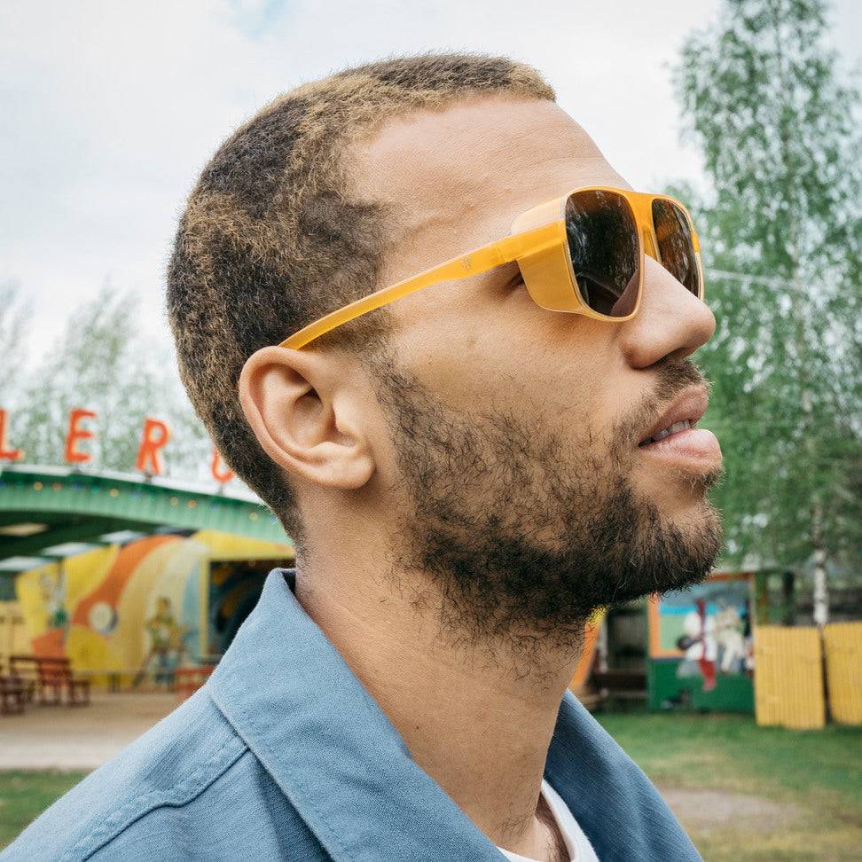 Mustard colored frame made from 100% recycled plastic, combined with a brown lens.