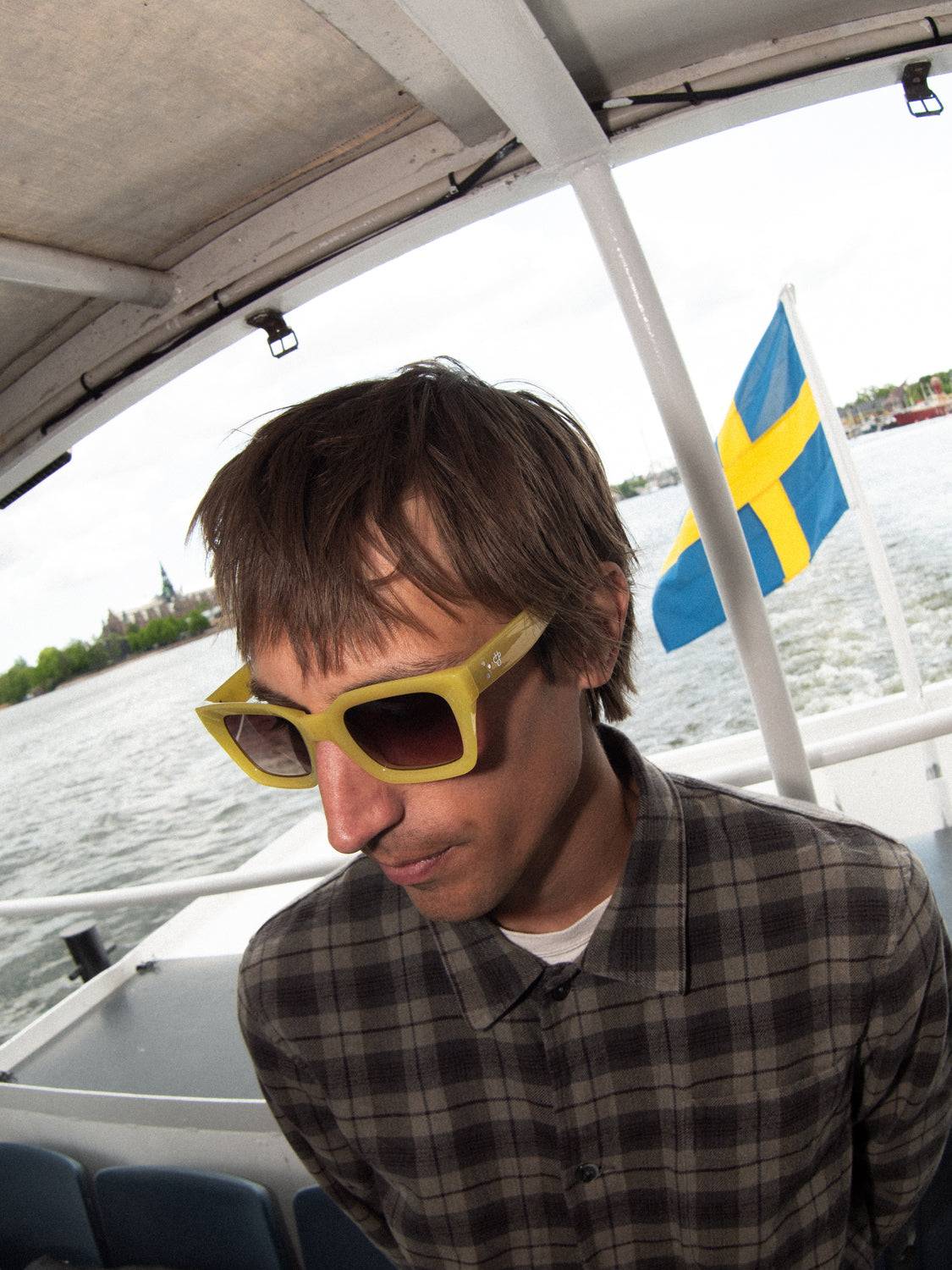 Yellow frame made from 100% recycled plastic, combined with an orange lens.