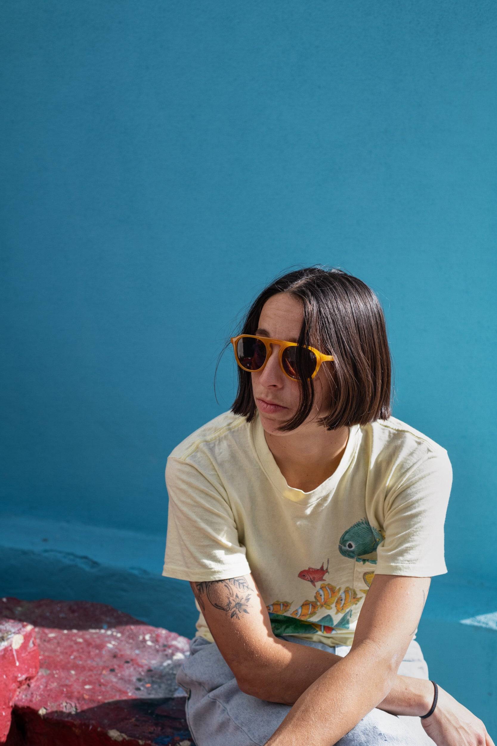 Mustard colored frame in 100% recycled plastic with brown lens.