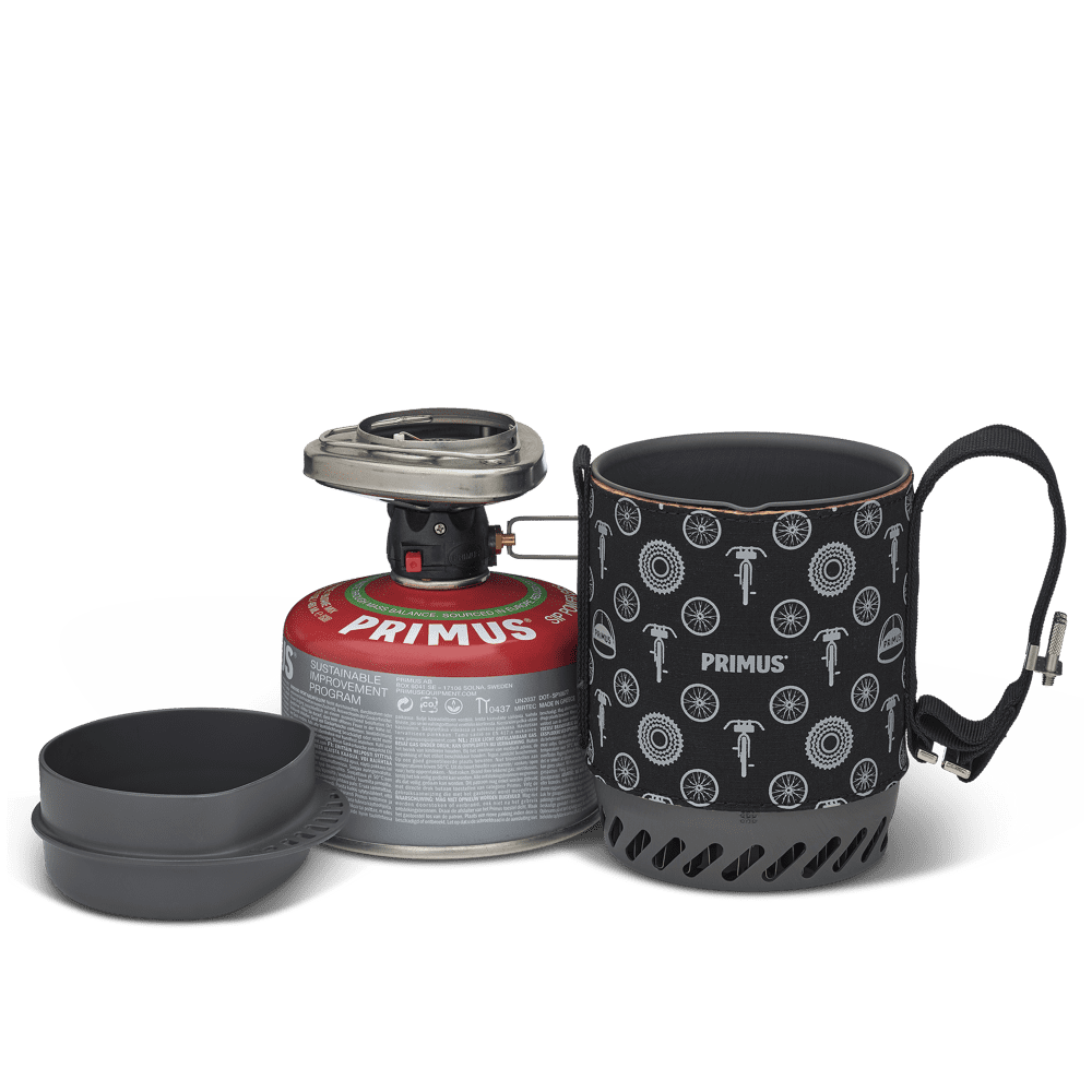 The burner and a 100g Primus gas canister fit in the hard-anodized saucepan, which also has an insulating sleeve in cork and G-1000 Eco Lite fabric for easy and safe handling.