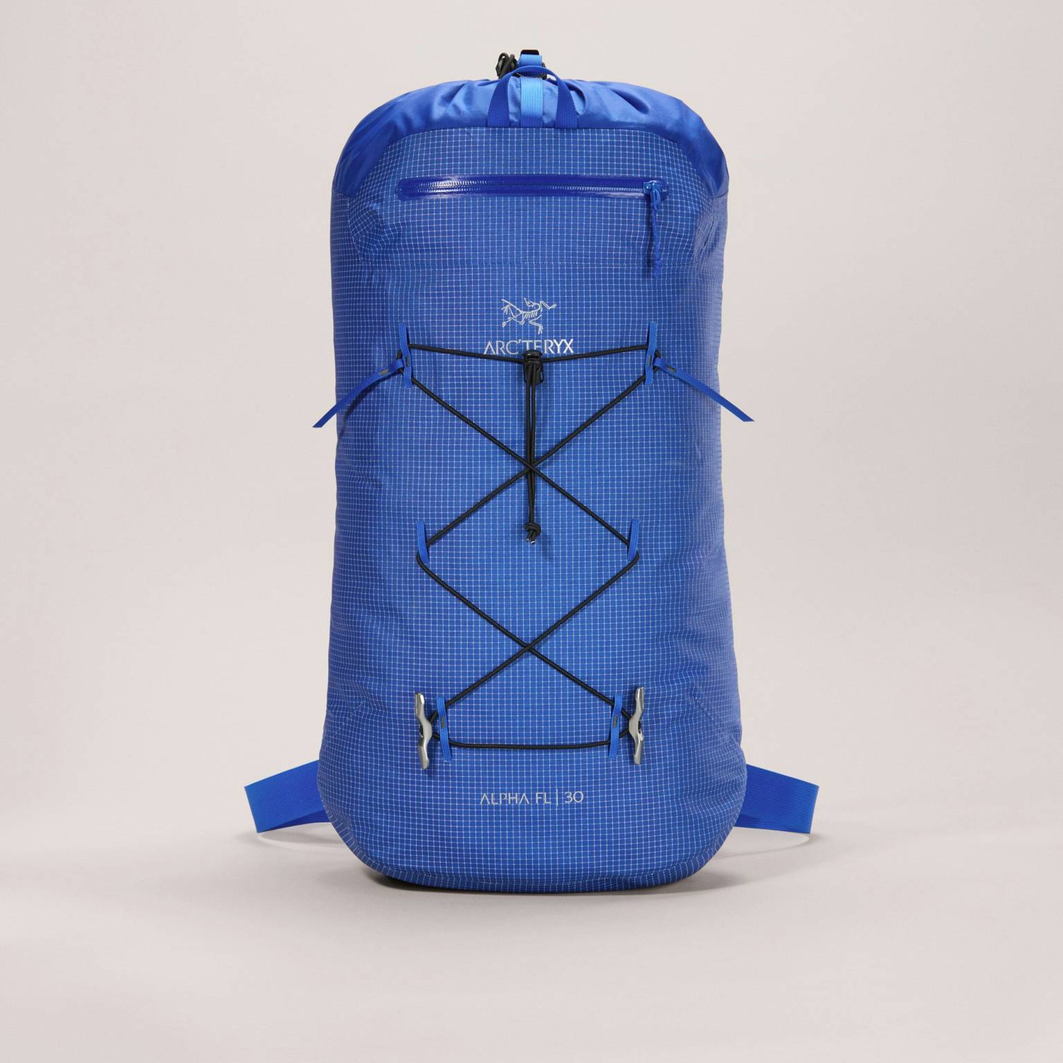 A virtually waterproof backpack that weighs only 648 grams. Holds 30 liters and can be expanded further with a roll-top. Two smaller external compartments for small items. Attachments for ice axes or other things on the front.