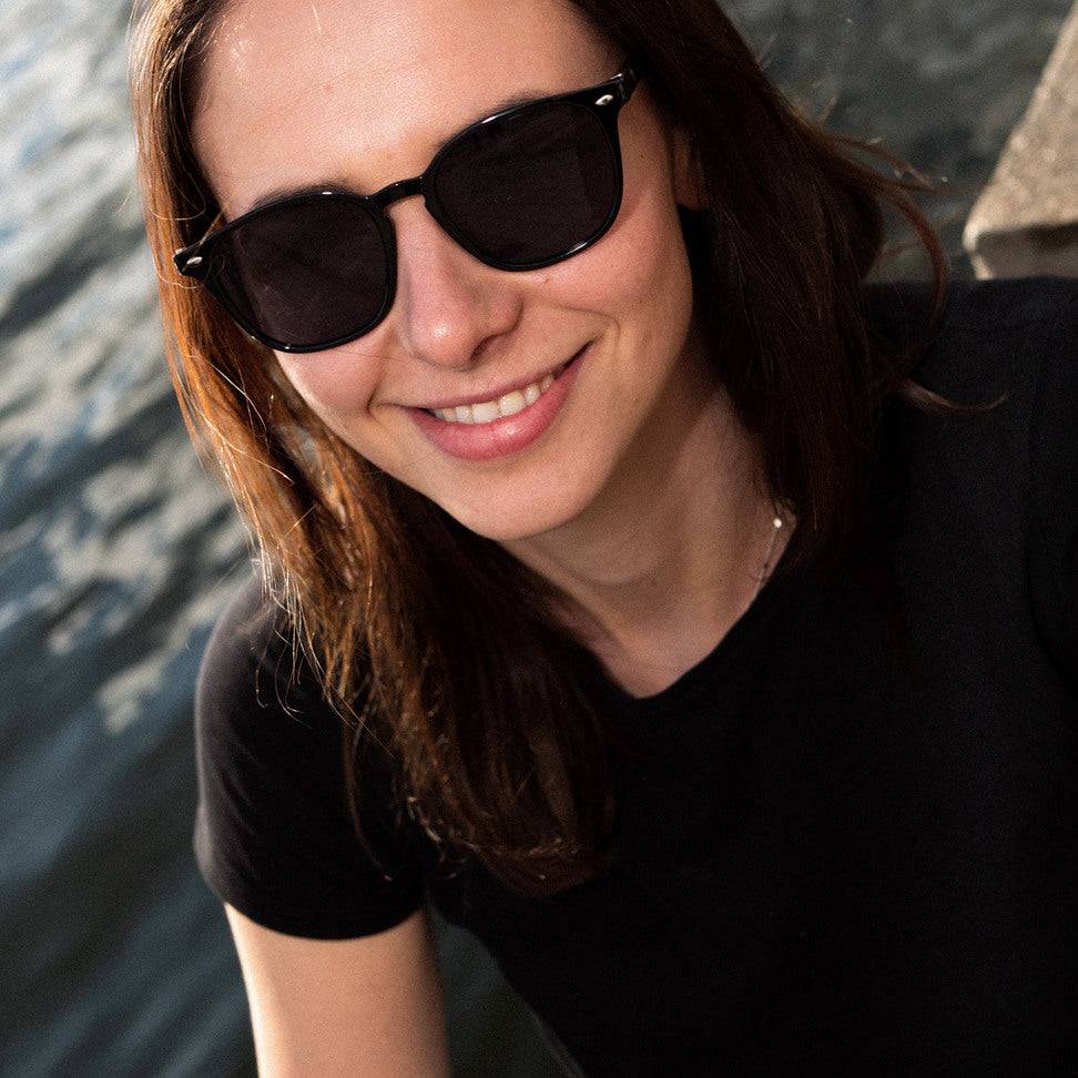 Svart båge tillverkad av 100% återvunnen plast, kombinerat med en svart lins.