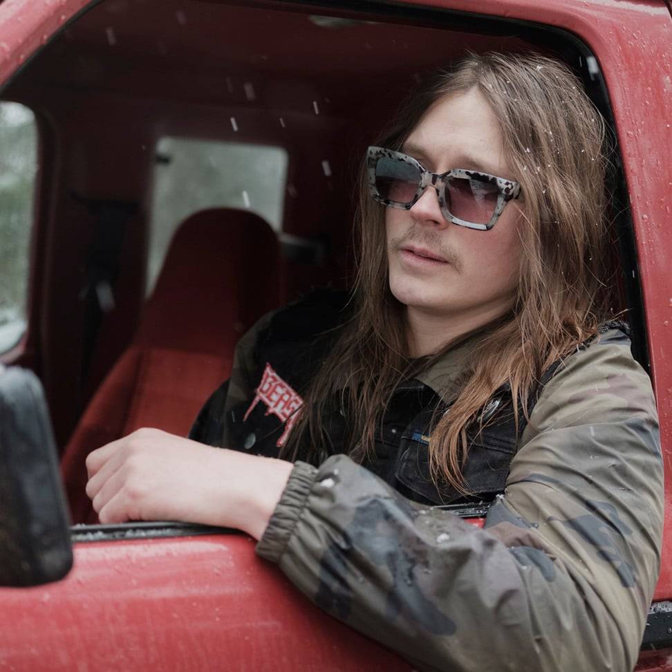 Svart båge tillverkad av 100% återvunnen plast, kombinerat med en mönstrad lins och tonad båge.