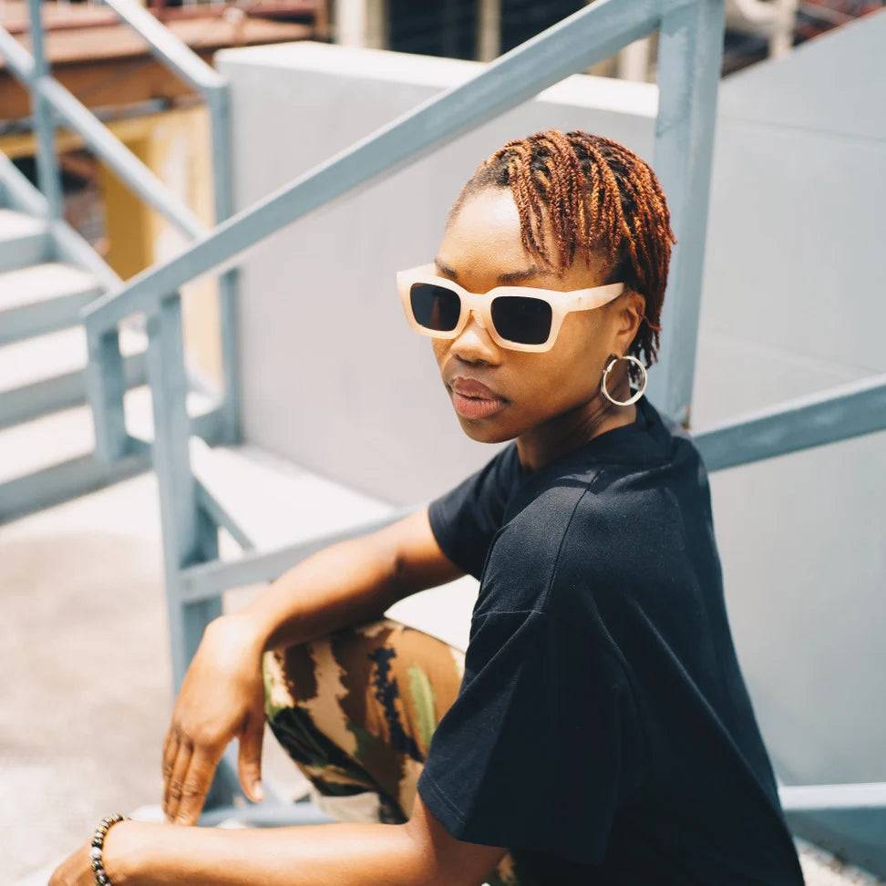 Ljus båge tillverkad av 100% återvunnen plast, kombinerat med en grå lins.
