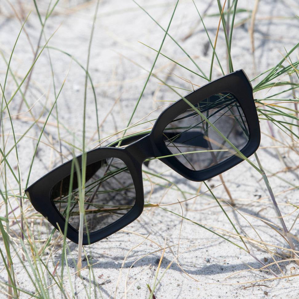 Svart båge tillverkad av 100% återvunnen plast, kombinerat med en svart lins.