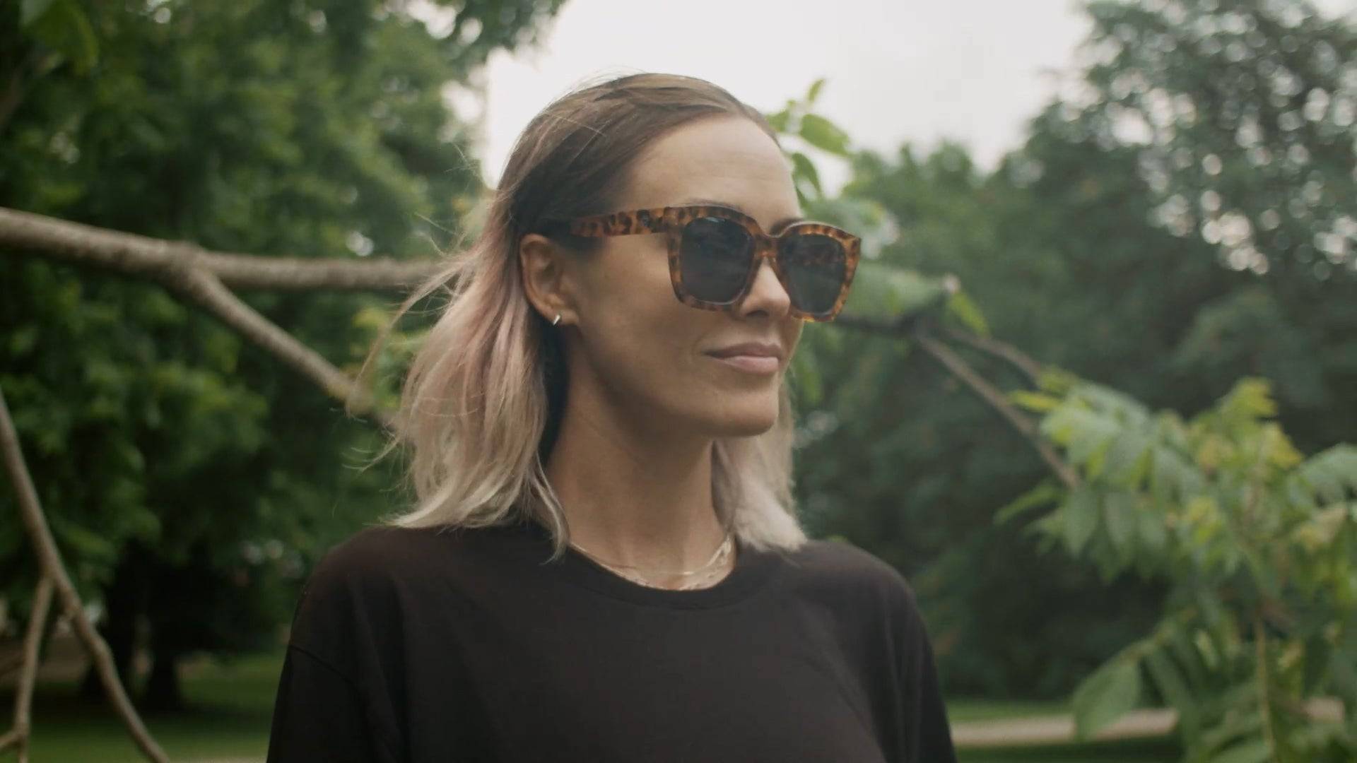 Leopardmönstrad båge tillverkad av 100% återvunnen plast, kombinerat med en svart lins.