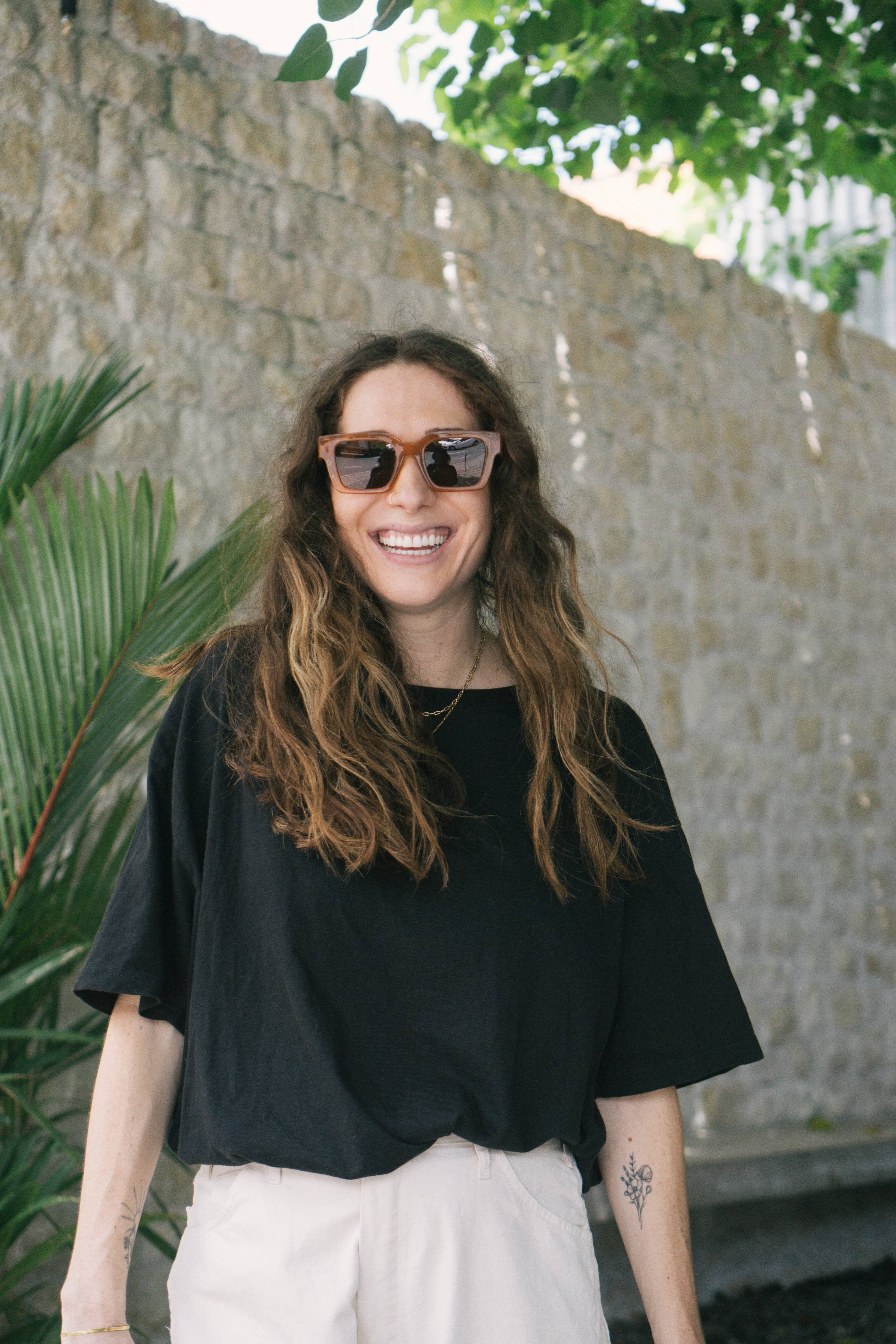 Senapsfärgad båge i 100% återvunnen plast med brun lins.