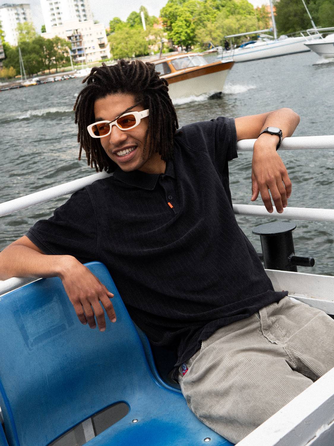 Kommer med en cremevit båge tillverkad av 100% återvunnen plast, kombinerat med en aprikosfärgad, transparent lins.