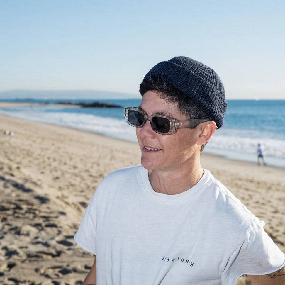 Grå transparent båge tillverkad av 100% återvunnen plast, kombinerat med en svart lins.
