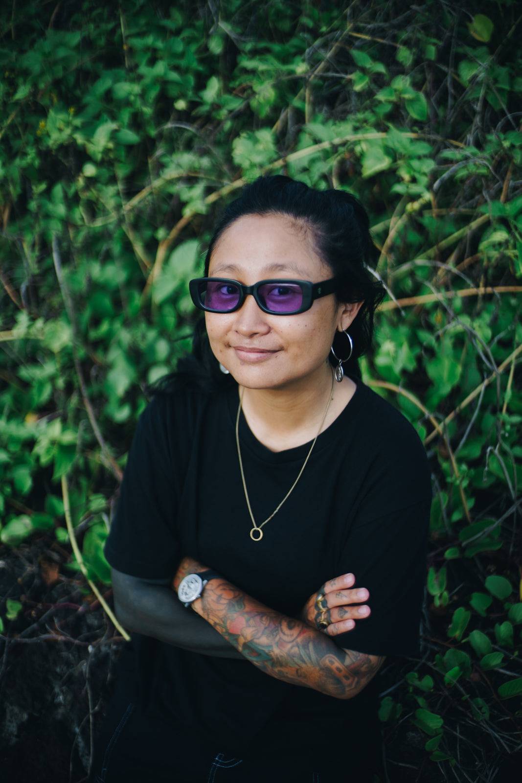 Svart båge tillverkad av 100% återvunnen plast, kombinerat med en lila lins.