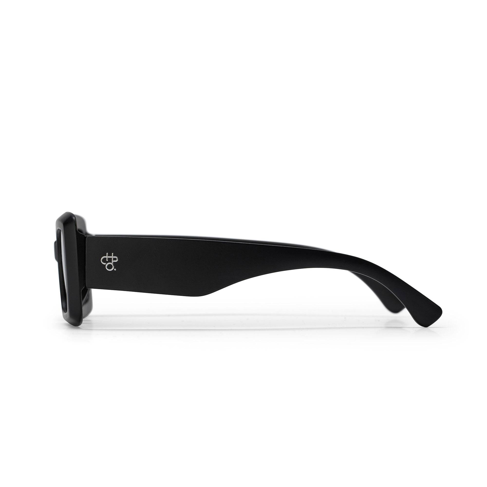 Svart båge tillverkad av 100% återvunnen plast, kombinerat med en svart lins.