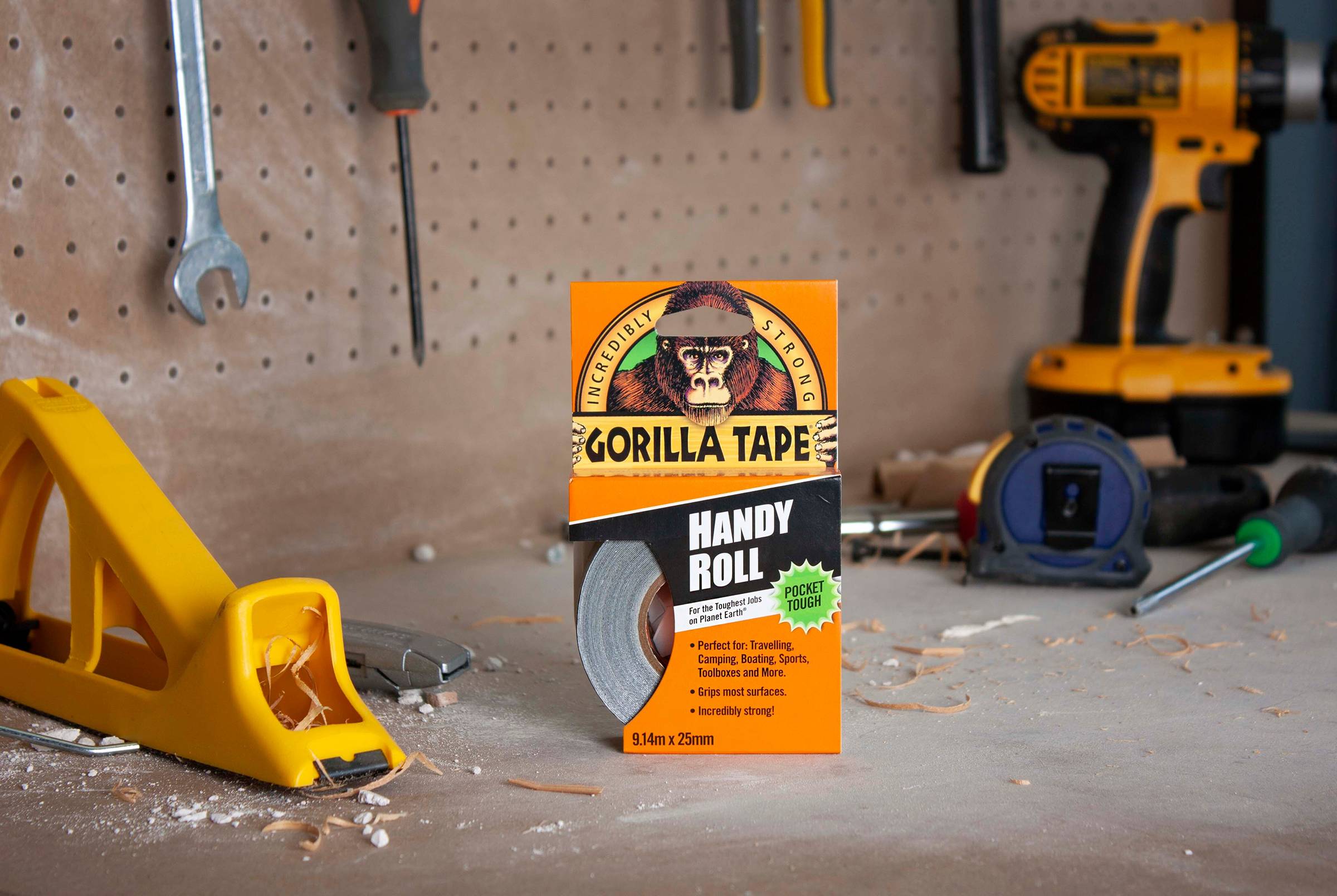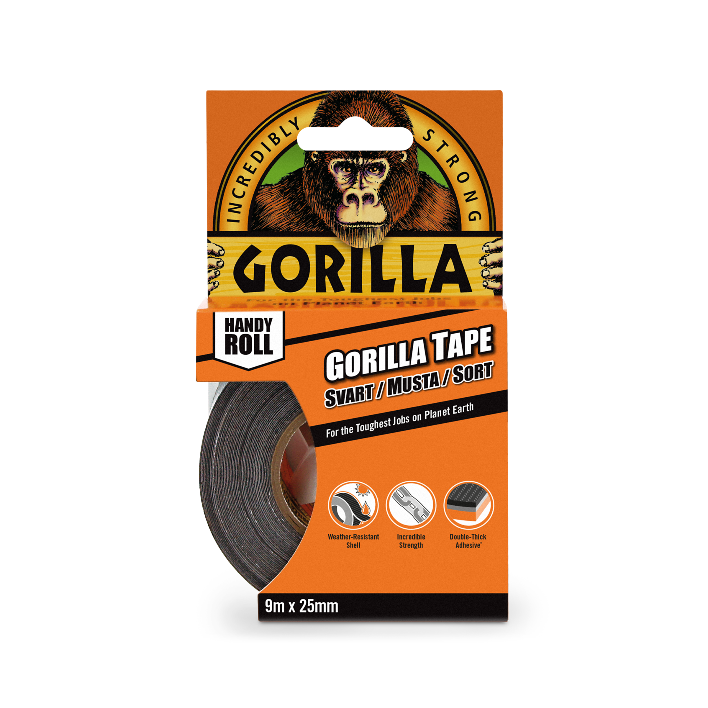 Gorilla tape svart ”to go”, en vattenavisande tejp som klarar av alla väderförhållanden och underlag i ett smidigt format som är lätt att ha med sig på alla äventyr. Gjord för grova, ojämna, oförsonliga ytor som trä, sten, puts, gips, tegel och mycket mer. Självklart fungerar den på de släta & jämna också.